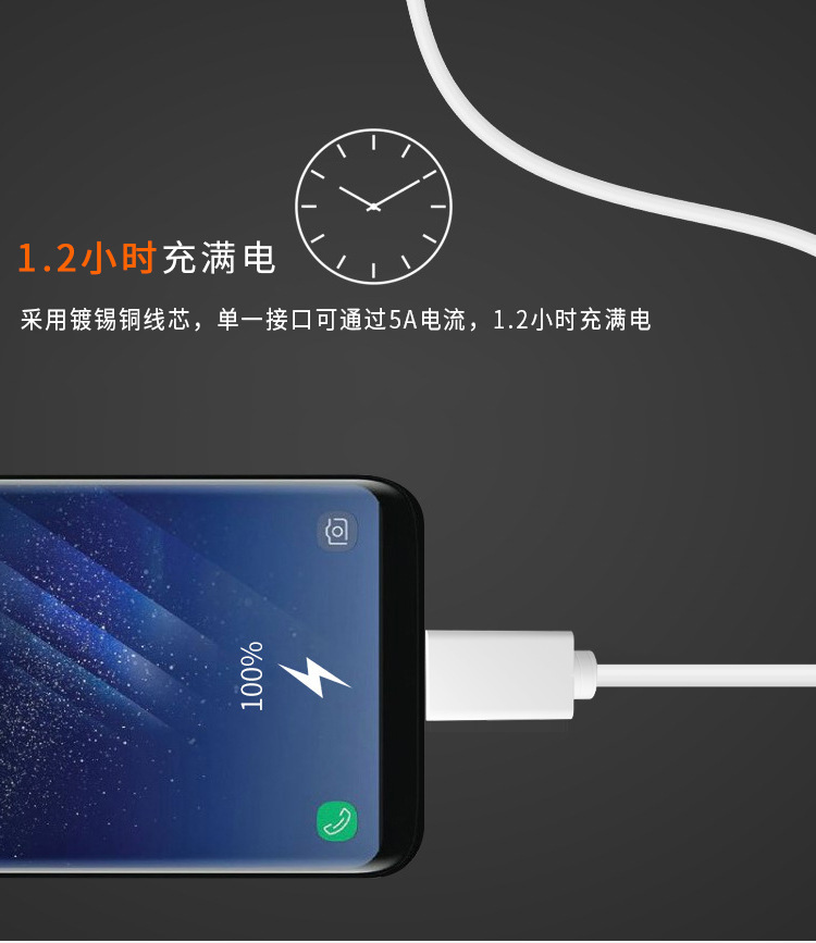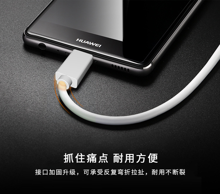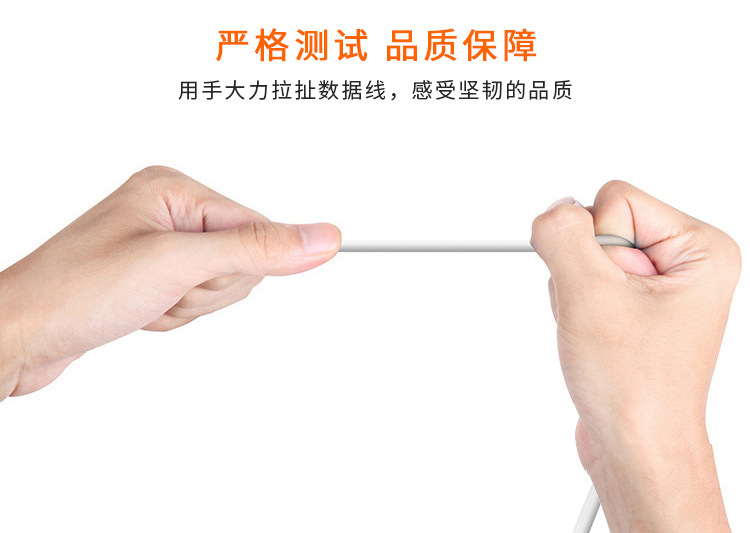 1,線材采用TPE阻燃材料+防斷線,線徑4.0mm,數據線100%全測全檢。符合天貓五項測試標準,5K次拔插測試,1500次以上搖擺檢測,5公斤拉扯檢測,24小時鹽霧檢測以阻燃測試。