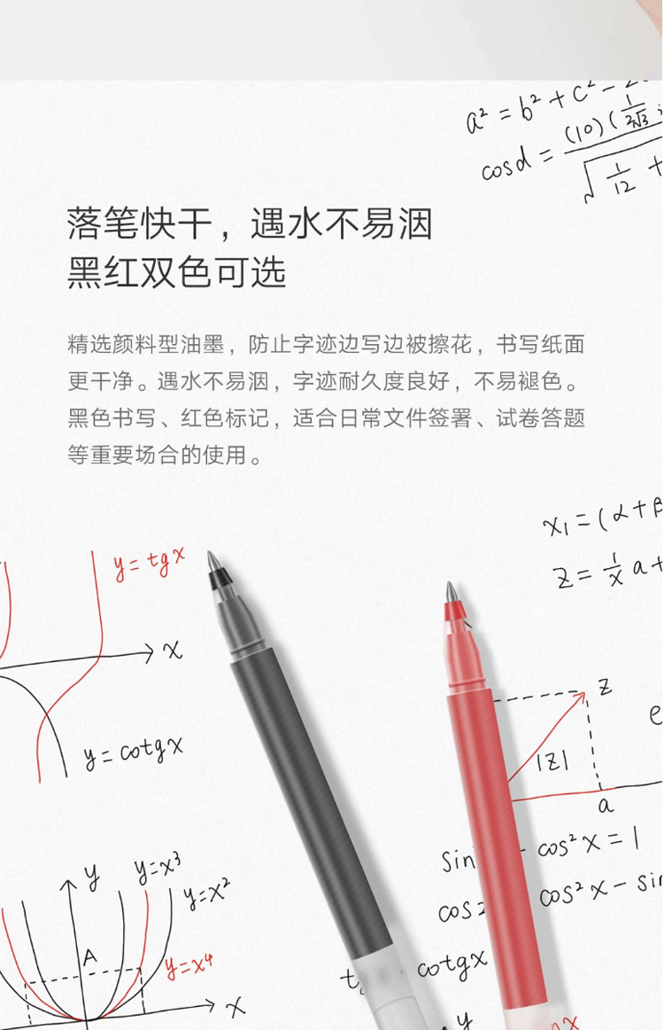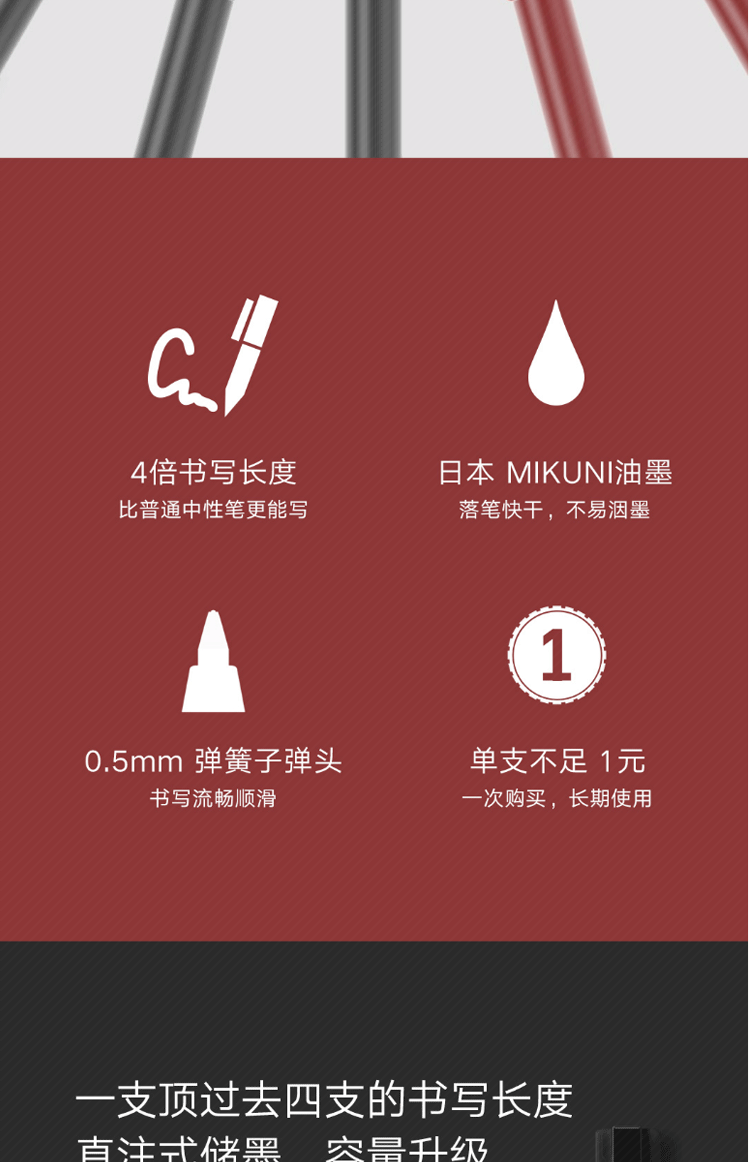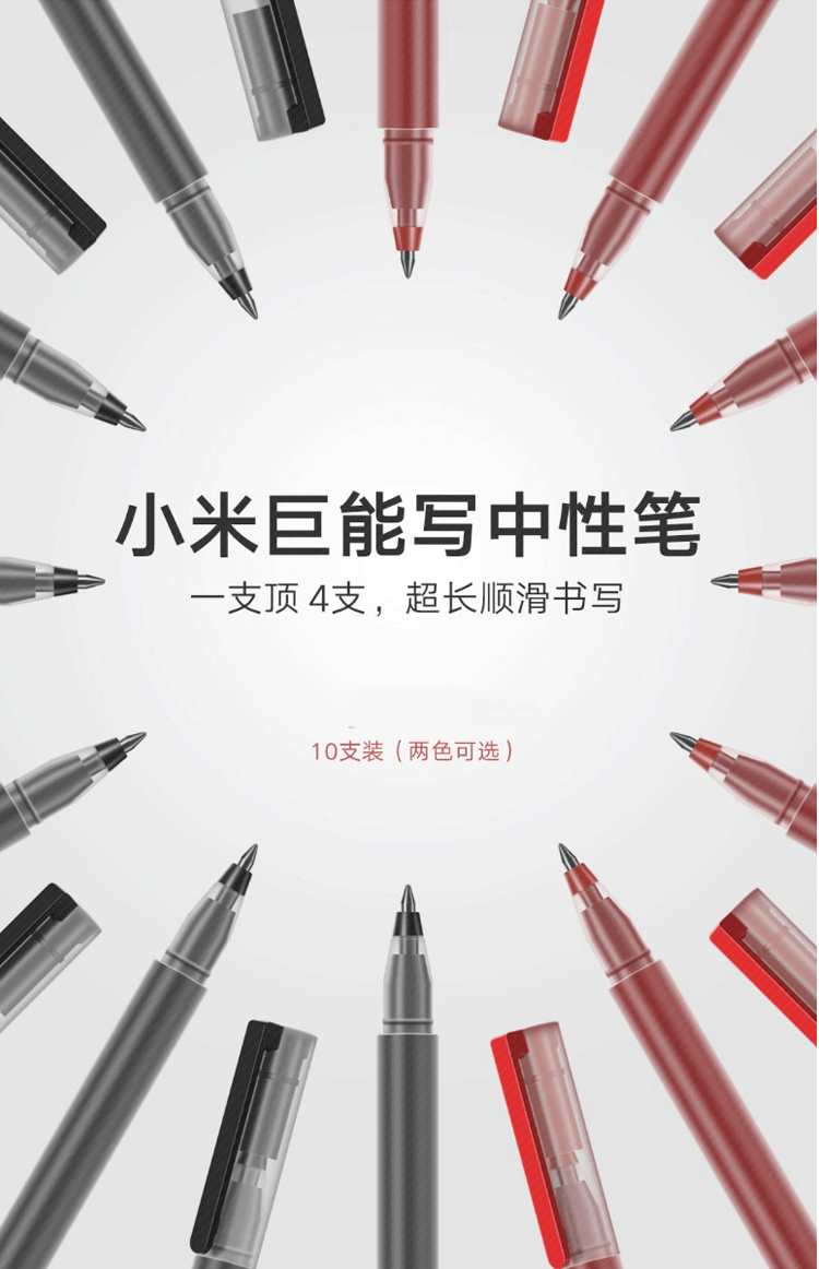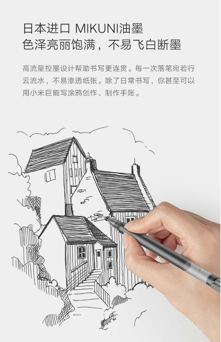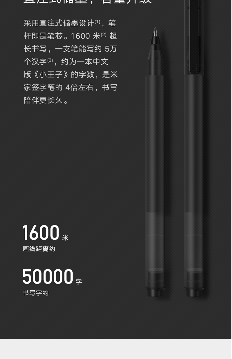小米巨能寫中性筆采用直注式儲墨設計,筆桿即是筆芯,畫線距離約1600米,一支筆能寫約5萬個漢字,是米家簽字筆的4倍左右。