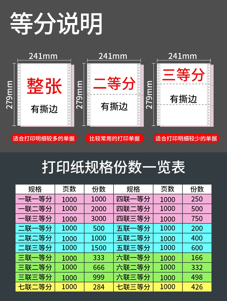 品種齊全,排孔,紙張加工精度高。適用于各種針式打印機(jī),產(chǎn)品表面潔白細(xì)膩,打印走紙順暢,孔位準(zhǔn)確,不易斷紙,配頁整齊打印同步好,紙張不錯(cuò)位。用途:實(shí)現(xiàn)多聯(lián)套打,用于提單,貨運(yùn)單據(jù),條碼單等。